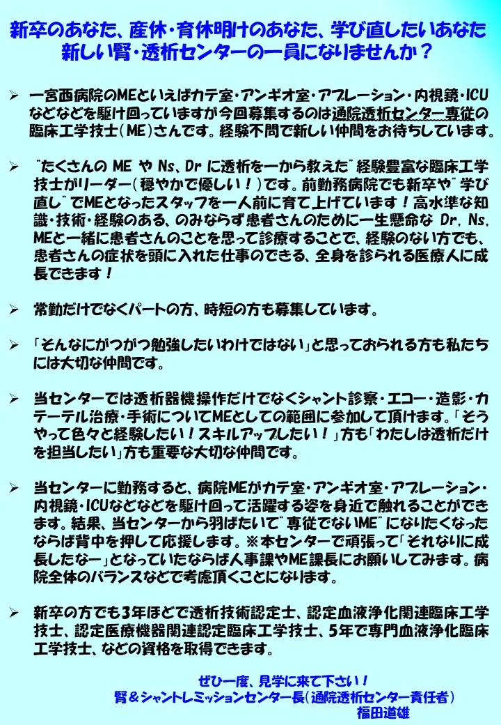 | 勤務地 | 一宮西病院 透析センター 愛知県一宮市開明字平1番地 |