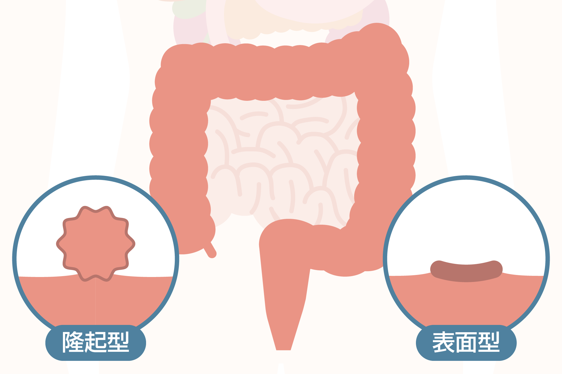 大腸がんの発生パターンは、良性の大腸ポリープががん化する場合、粘膜上に直接がんが生じる場合、慢性的な炎症からがんが発生する場合、遺伝などがあります。