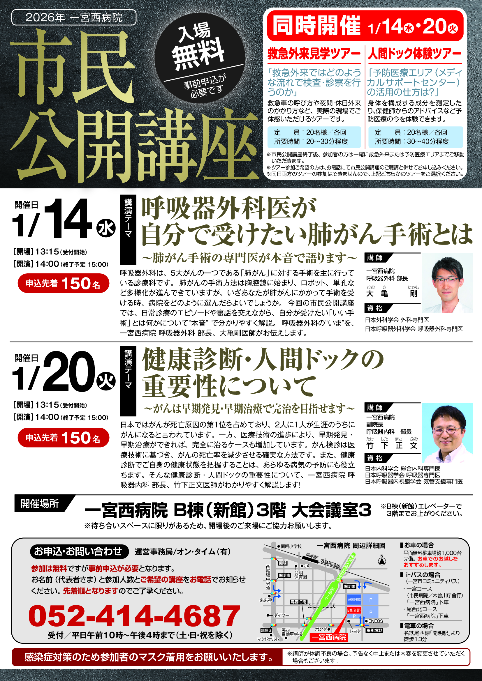 呼吸器外科は、5大がんの一つである「肺がん」に対する手術を主におこなっている診療科です。肺がんの手術方法は胸腔鏡に始まり、ロボット、単孔など多様化が進んできていますが、いざあなたが肺がんにかかって手術を受ける時、病院をどのように選んだらよいでしょうか。今回の市民公開講座では、日常診療のエピソードや裏話を交えながら、自分が受けたい「いい手術」とは何かについて“本音” で分かりやすく解説。呼吸器外科の“いま”を、一宮西病院 呼吸器外科部長・大亀 剛医師がお伝えします。
