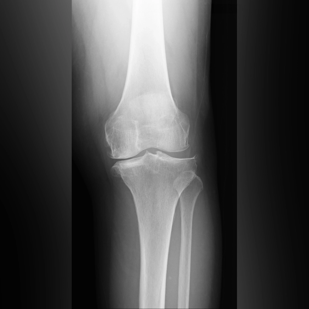 O脚変形がみられる場合、初期のレントゲンでは外側関節に比べて内側関節の隙間がやや狭くなっています。これは内側の軟骨が少し減ってきた状態を示しています。