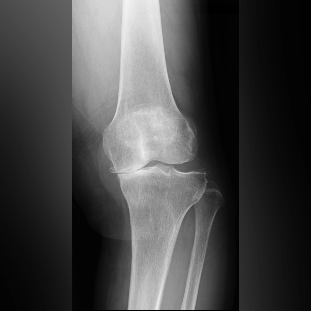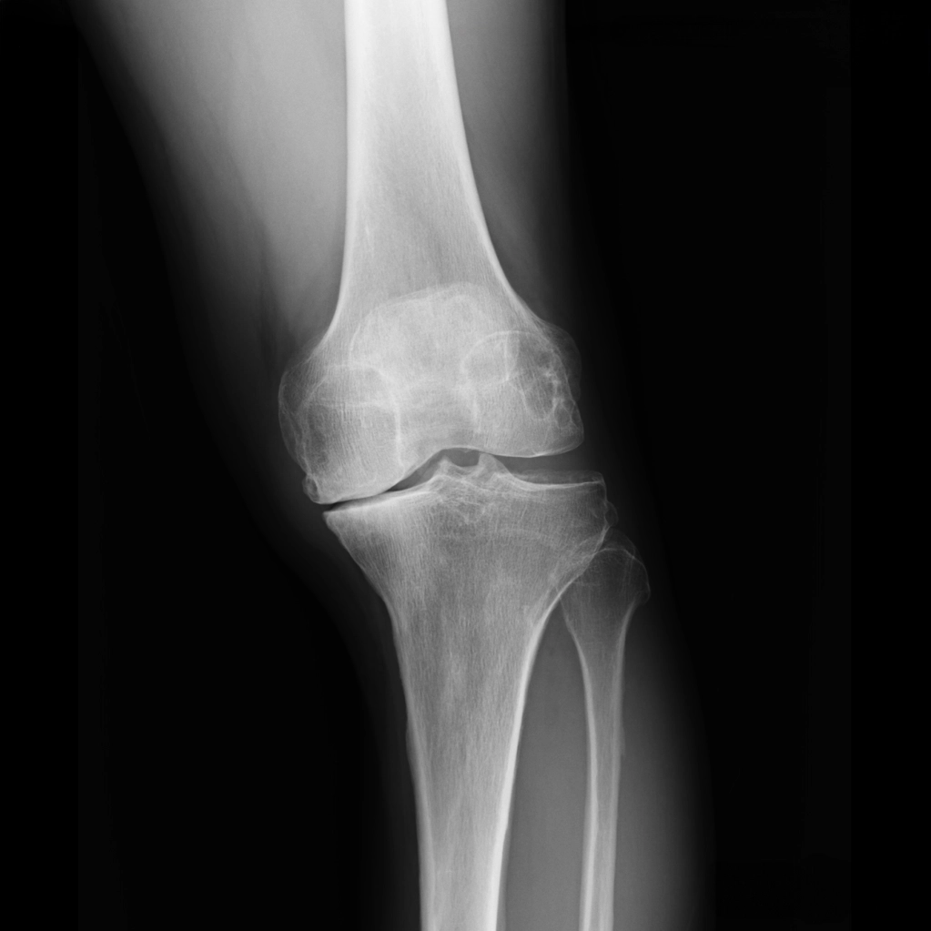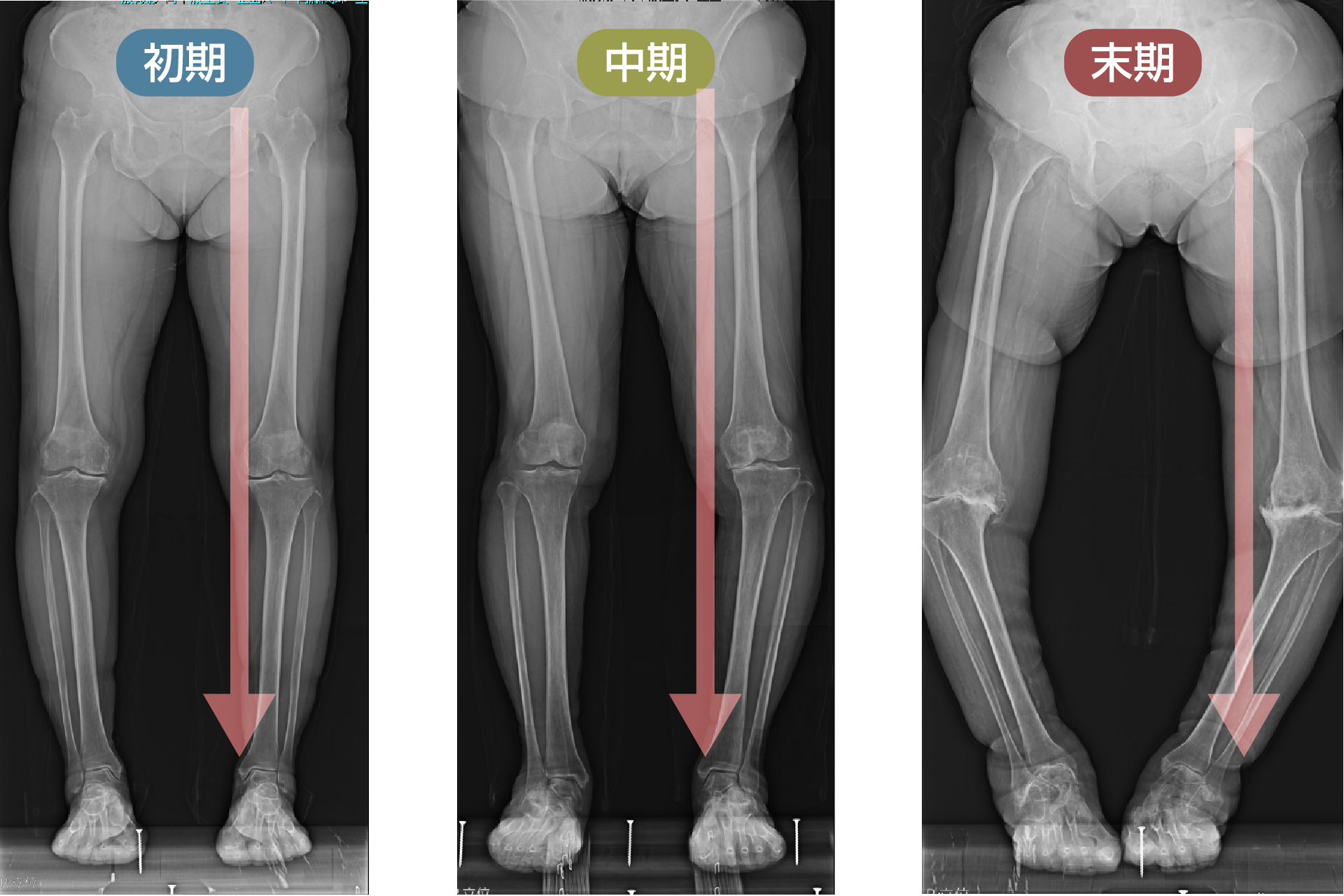 中期のレントゲンでは、内側関節の隙間がほとんどなくなります。この段階では、内側の軟骨が完全に失われ、大腿骨と脛骨が直接ぶつかっている状態です。低い椅子から立ち上がる際にゴリゴリという音がしたり、骨表面に髪の毛ほどの細いひび(微小骨折)が生じて強い痛みを感じるようになります。この中期変形性関節症の時期になると、痛みのために歩くのがつらくなる方が多くなります。