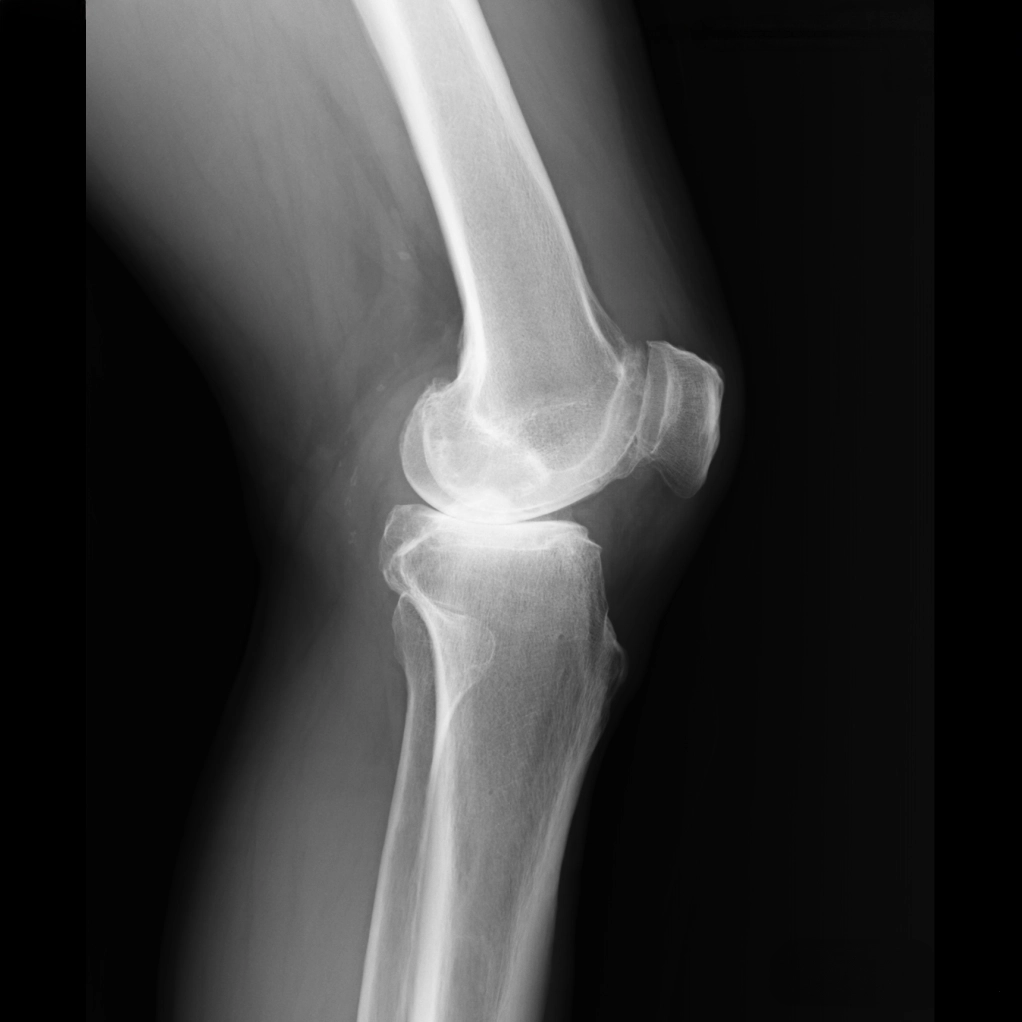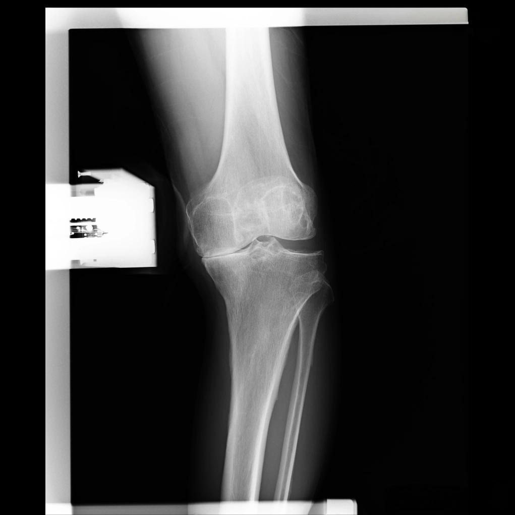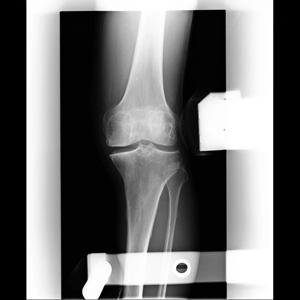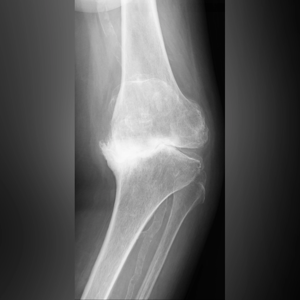 中期のレントゲンでは、内側関節の隙間がほとんどなくなります。この段階では、内側の軟骨が完全に失われ、大腿骨と脛骨が直接ぶつかっている状態です。低い椅子から立ち上がる際にゴリゴリという音がしたり、骨表面に髪の毛ほどの細いひび(微小骨折)が生じて強い痛みを感じるようになります。この中期変形性関節症の時期になると、痛みのために歩くのがつらくなる方が多くなります。