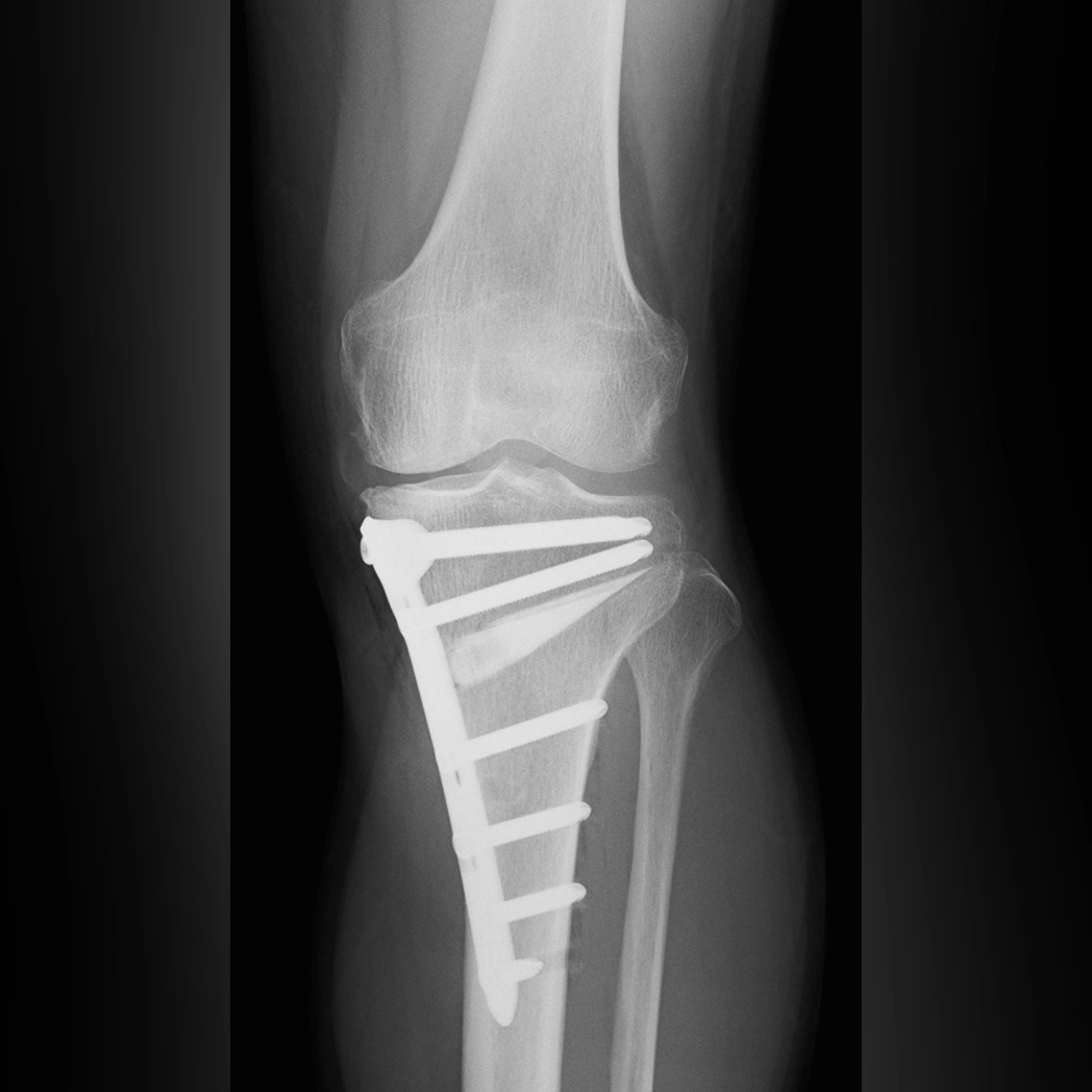 では、骨切り術でひざの内側の痛みが軽くなるのはなぜでしょうか。それは、ひざの軸がまっすぐになることで、荷重の通り道がひざのより内側から関節の中央へと移動するためです。荷重がひざの中央を通るようになると、外側に残っていた関節軟骨が機能しはじめ、痛みなく歩けるようになります。実際、足を振って歩いているうちに、軟骨が失われた内側に線維軟骨が新たに形成されたという報告もあります。