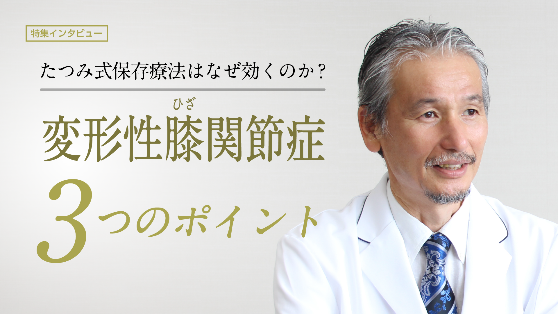 ひざ関節の分野において数多くの手術を手掛けてこられた巽 一郎医師。その豊富な経験を持ちながら、「すぐには手術をしない医師」、「ひざの保存療法の第一人者」としても知られています。今回は、巽医師が考える“ひざ治療”について、お話を伺いました。