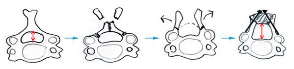 脊髄管の前後径が1.5~2倍に拡大します(赤矢印)