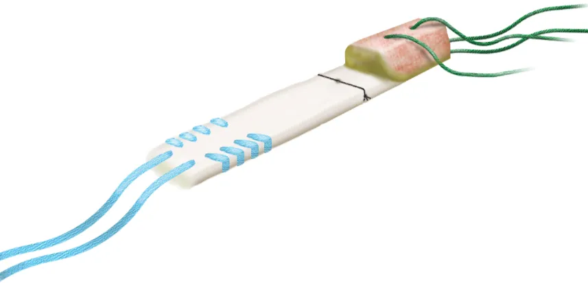 移植腱の片端に骨がついており、もう片端は靭帯成分です。骨がついている方は大腿骨側の骨孔に入り、靭帯成分は脛骨側に入ります。半腱様筋腱より破断強度が高いとされています。また、 骨付き膝蓋腱と比べて、膝を地面に付く箇所に創部がないので、痛みは骨付き膝蓋腱よりも少なく、地面に膝をつく動作をおこなう点で有利です。半腱様筋腱は特に若年女性では成熟していないことがあり、強度が不十分なケースがあります。骨付き四頭筋腱は若年でも比較的早く成熟しているため、十分な腱強度が期待でき、良好なグラフトになると考えます。