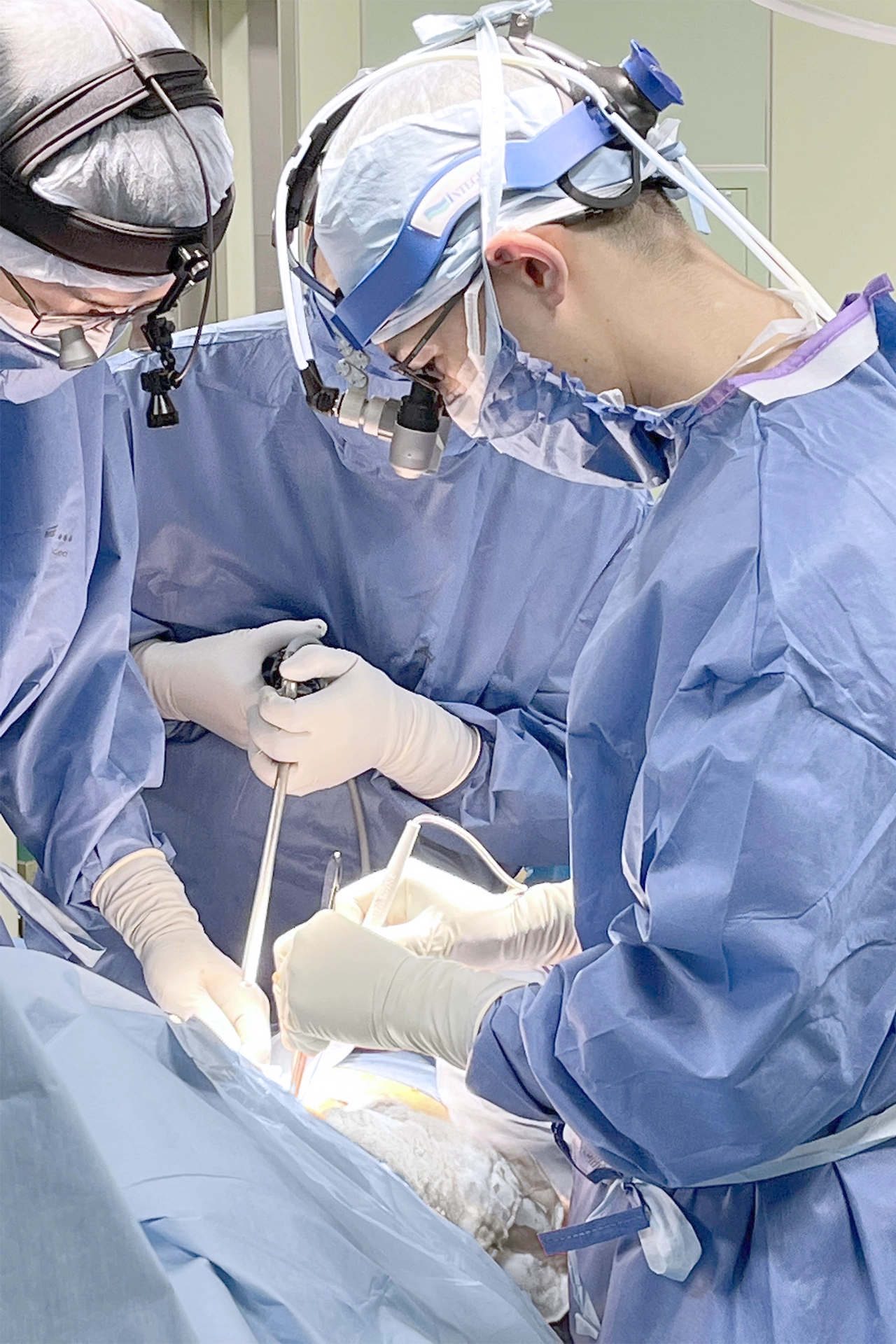 当科の手術では、関連学会で近年報告されているデュアル・カバーリング法(肺表面を補強材で二重に覆う方法)を用いて肺表面の補強をおこなっています。また、多くの患者さまが手術後2日以内に退院されています。手術では空気漏れの部分を直接修復できるため、多くの場合早く退院することができます。左右両側の気胸の治療が必要な場合、病状等にもよりますが両側とも同時に手術をおこなうことも可能です。