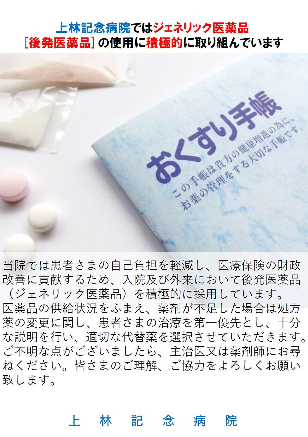 上林記念病院ではジェネリック医薬品 [後発医薬品]の使用に積極的に取り組んでいます ホーム > 病院紹介 > より良い医療提供に向けた取り組み > 上林記念病院ではジェネリック医薬品 [後発医薬品]の使用に積極的に取り組んでいます [印刷ボタン機能]JavaScript推奨 当院では患者さまの自己負担を軽減し、医療保険の財政改善に貢献するため、入院及び外来において後発医薬品(ジェネリック医薬品)を積極的に採用しています。 医薬品の供給状況をふまえ、薬剤が不足した場合は処方薬の変更に関し、患者さまの治療を第一優先とし、十分な説明を行い、適切な代替薬を選択させていただきます。 ご不明な点がございましたら、主治医又は薬剤師にお尋ねください。皆さまのご理解、ご協力をよろしくお願い致します。