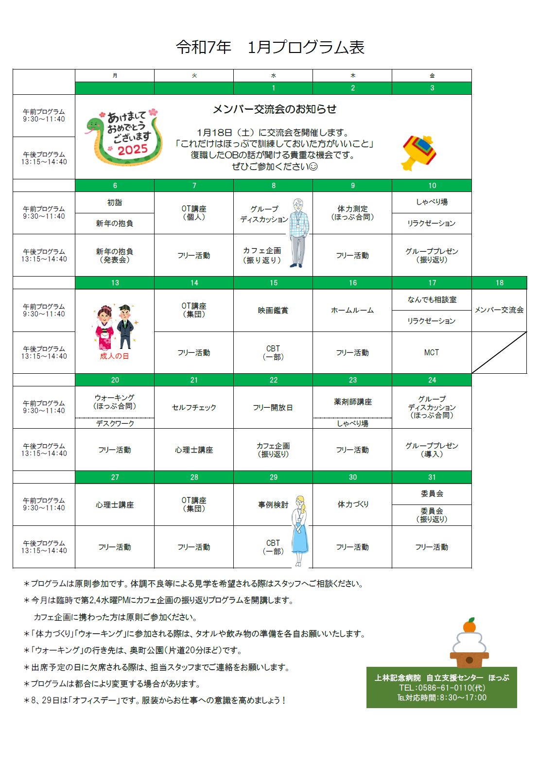1月18日 メンバー交流会開催のお知らせ ホーム > 病院からのお知らせ > 1月18日 メンバー交流会開催のお知らせ [印刷ボタン機能]JavaScript推奨 2025年1月18日(土)に自立支援センターほっぷ「メンバー交流会」を開催 いたします。 ほっぷOB・OGの方、ならびに現役通所者の方を対象としております。 参加を希望される方はほっぷスタッフまで連絡をお願いいたします。 皆様にお会いできることを心待ちにしています。 また、1月の「ほっぷ新聞」について諸事情により掲載が遅れます。 新聞掲載までもうしばらくお待ちください。 ほっぷスタッフ一同