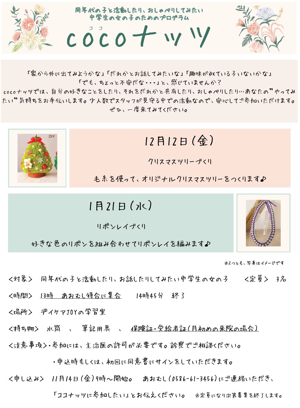 11月14日(金)9時に申し込みを開始します。お電話または、直接スタッフまで。「ココナッツに参加したい」とお伝えください。