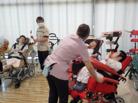 【行事】まだまだ厳しい暑さの中、L2病棟では夏祭りが行われました。おやつの屋台と射的の屋台が登場。さてどんな景品が当たるのかな?利用者様もご家族様も豪華な景品を狙い撃ち、なかなか当たらず落胆の声もありましたが、当たれば皆自分の事のように大喜びしました。外の暑さに負けないぐらい白熱した夏祭りでした。