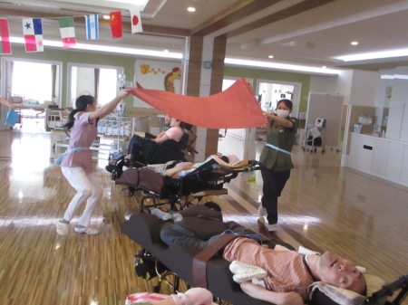 【行事】9月になりまだまだ暑い日が続いていますが、4階ではそんな暑さにも負けない熱い運動会が繰り広げられました。玉入れでは一生懸命身体を使って得点をゲットしていました。玉運びでは職員がビーチボボールを落としてしまう度に笑い声が響きました。利用者様全員参加することができ、楽しい時間を過ごしました。