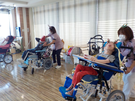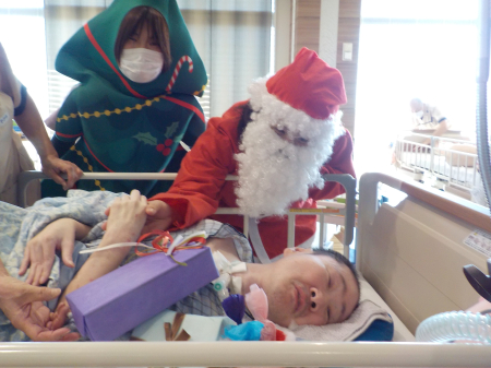 【行事】センターから見える山肌には、ほんのり雪がかかって冬らしくなりました。L2病棟ではクリスマスイブよりかなり早くサンタさんが慌てた様子でやって来ました。「袋がやぶれてプレゼントを落としてしまった」としょんぼり、そこで利用者様が一致団結しプレゼントを探して歩きました。親切にしてもらったサンタさんは感謝と共に「年末年始みんなが元気で過ごせるように祈っているからね」と言葉のプレゼントを置いて旅立ちました。
