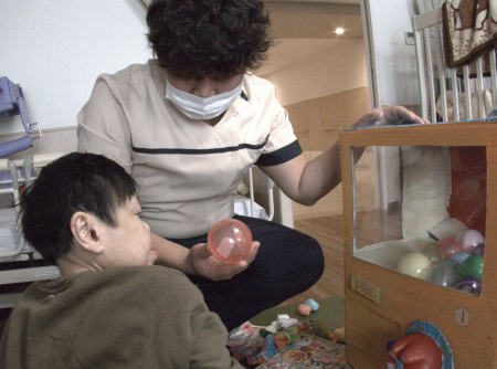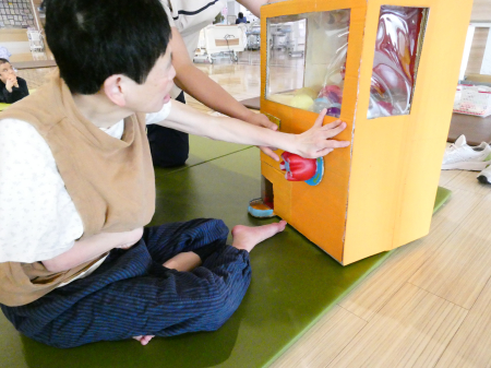 【活動】手作りのガチャガチャを回し、音楽鑑賞の曲目を決めています。利用者様と職員が一緒にガチャガチャを回すと歓声が上がっていましたよ。楽しい活動時間を過ごせるよう盛り上げています。