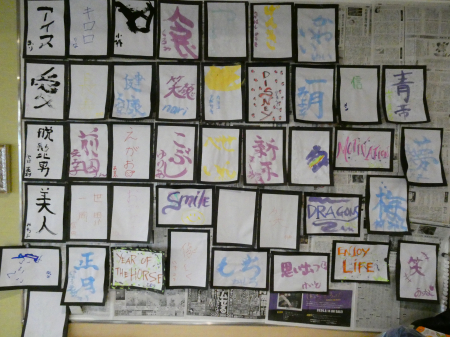【行事】1月は利用者様全員で新年の抱負を書初めしました。利用者様の思いを習字紙に書き、みんなで壁面に飾り、2026年初の壁面装飾を完成させることが出来ました。カラフルな絵の具で文字を書くことで、オリジナリティ溢れる書初めとなり、素敵な1年をはじめられることができました。本年もよろしくお願いいたします。